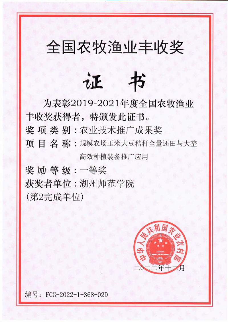 日前,农业农村部公布了2019—2021年度“全国农牧渔业丰收奖”获奖名单,我院周成研究员参与申报的“规模农场玉米大豆秸秆全量还田与大垄高效种植装备推广应用”项目获成果奖一等奖。
