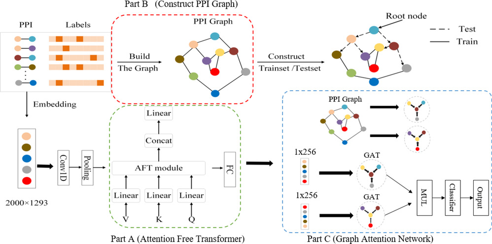 蛋白质相互作用(PPI)的研究对于生物医学发展至关重要,对PPI的深入理解可以为正常和疾病状态下的细胞生理学提供更多的见解,对基础科学和药物发现具有重大意义。然而,未知PPI预测仍然是一个挑战性的问题。为此,该课题组提出了一种新的神经网络模型AFTGAN,用于预测多种类型PPI。该方法在特征输入方面,除了氨基酸共现相似性和独热编码以外,还添加了含有大量蛋白质生物学信息的语言模型ESM-1b嵌入作为蛋白质序列特征。在网络框架部分,构建了一个基于Transformer编码器的集成网络,包含Attention Free Transformer (AFT) 模块和图注意力网络(GAT)。其中,AFT模块用于对重要蛋白质序列特征信息进行加权计算,而图注意力网络(GAT)主要用于提取蛋白质对的关系特征。在SHS27K和SHS148K数据集上的实验结果显示,AFTGAN优于其他使用随机、深度优先搜索(DFS)和广度优先搜索(BFS)划分的方法。测试集tSTRING数据集的实验结果表明,AFTGAN模型在预测未知PPI方面具有性能优势。