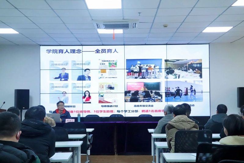 会议最后由宁波大学阳明学院院长战洪飞为全体教师开展“培根铸魂 学以成人”讲座。他首先介绍了宁波大学以及阳明学院基本情况,重点围绕学风启航、名师启航、学长启航、素质起航和荣誉启航等五个方面展开讲授,倡导学院搭建师生交流平台,开展多样化的素质拓展活动,并希望在座老师能努力实践,进一步改进和提高学院的教育质量。