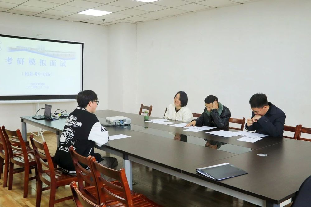 为进一步帮助2024届上线考研学生更好地准备复试面试考研,助力2024届考研学子提升复试技能,明确了解考研面试的基本流程,以成功上岸,2024年3月20日15:30,信息工程学院在31-903会议室开展了考研模拟面试活动,本次活动主要是校外考生专场,由吴小红、黄淳、高强三位老师进行模拟面试,为同学们提供了专业而清晰的面试过程。