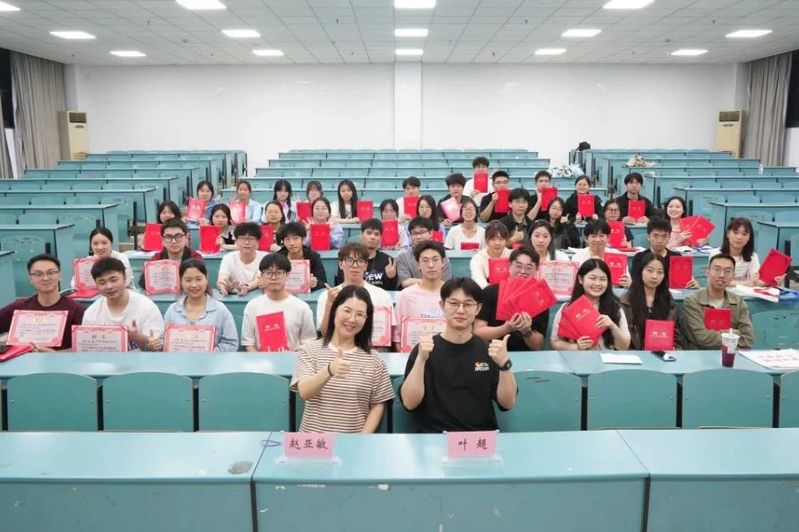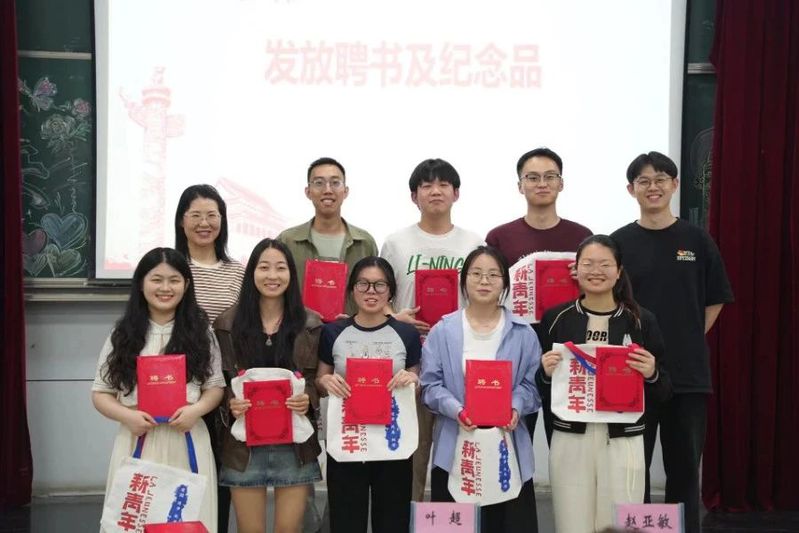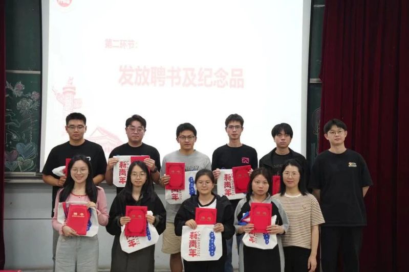 大会第二项,为学生干部发放任职聘书并合照留念。为表达党建中心对学生干部这一年来工作的肯定与鼓励,学院党建中心负责人赵亚敏老师与叶超老师为党建中心服务中心全体学生干部与支部支委发放任职聘书,并为任职两年的党建中心部长与支部支委发放定制的纪念品,随后由大学生党建服务中心新任中心主任张心叶宣读新任全体学生干部名单。