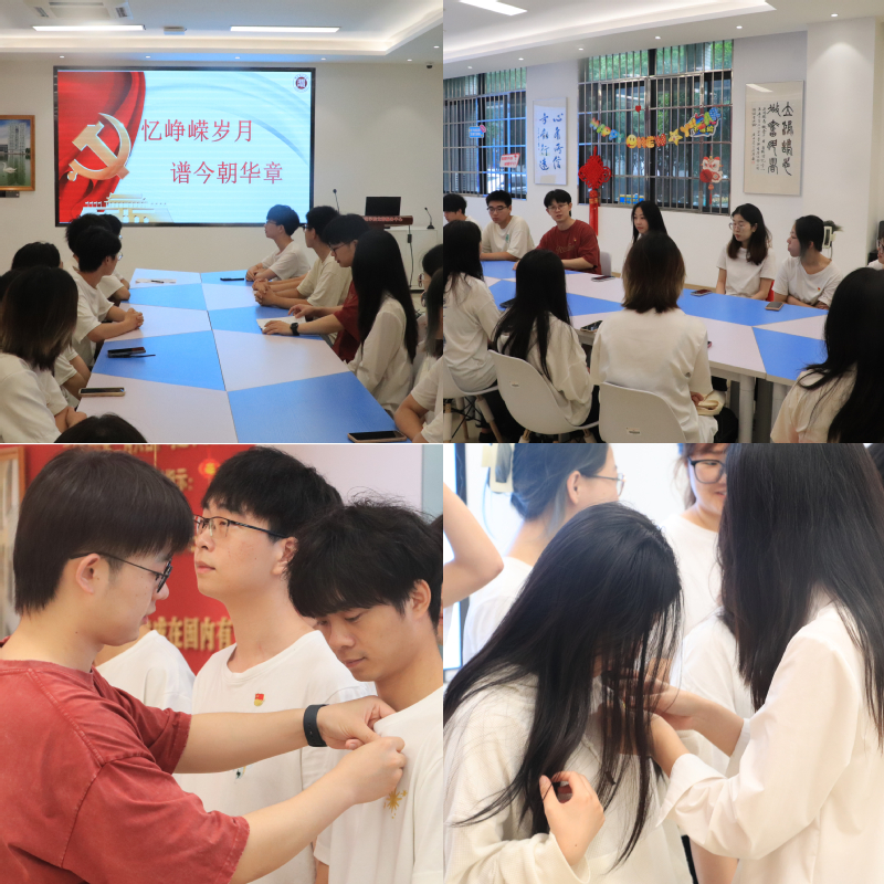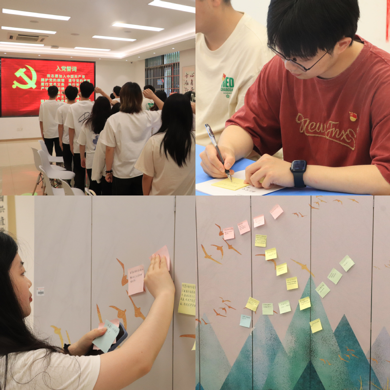 随后,学院本研学生联合党支部书记、大学生党建中心主任分别为本年度新发展党员佩戴党徽,鞭策新党员要牢记党员使命,自觉履行党员义务,充分发挥好党员的先锋模范作用。紧接着,在场全体党员肃立,面向党旗,在党员前辈的带领下,新发展党员庄严宣誓,共同回顾自己入党时的初心,进一步坚定了理想信念和为党和人民的事业奋斗终生的决心。宣誓后,全体党员用笔墨书写对党的感恩之情,并纷纷将自己对党的祝福贴在纪念墙上,表达了对党无限的忠诚与敬爱。
