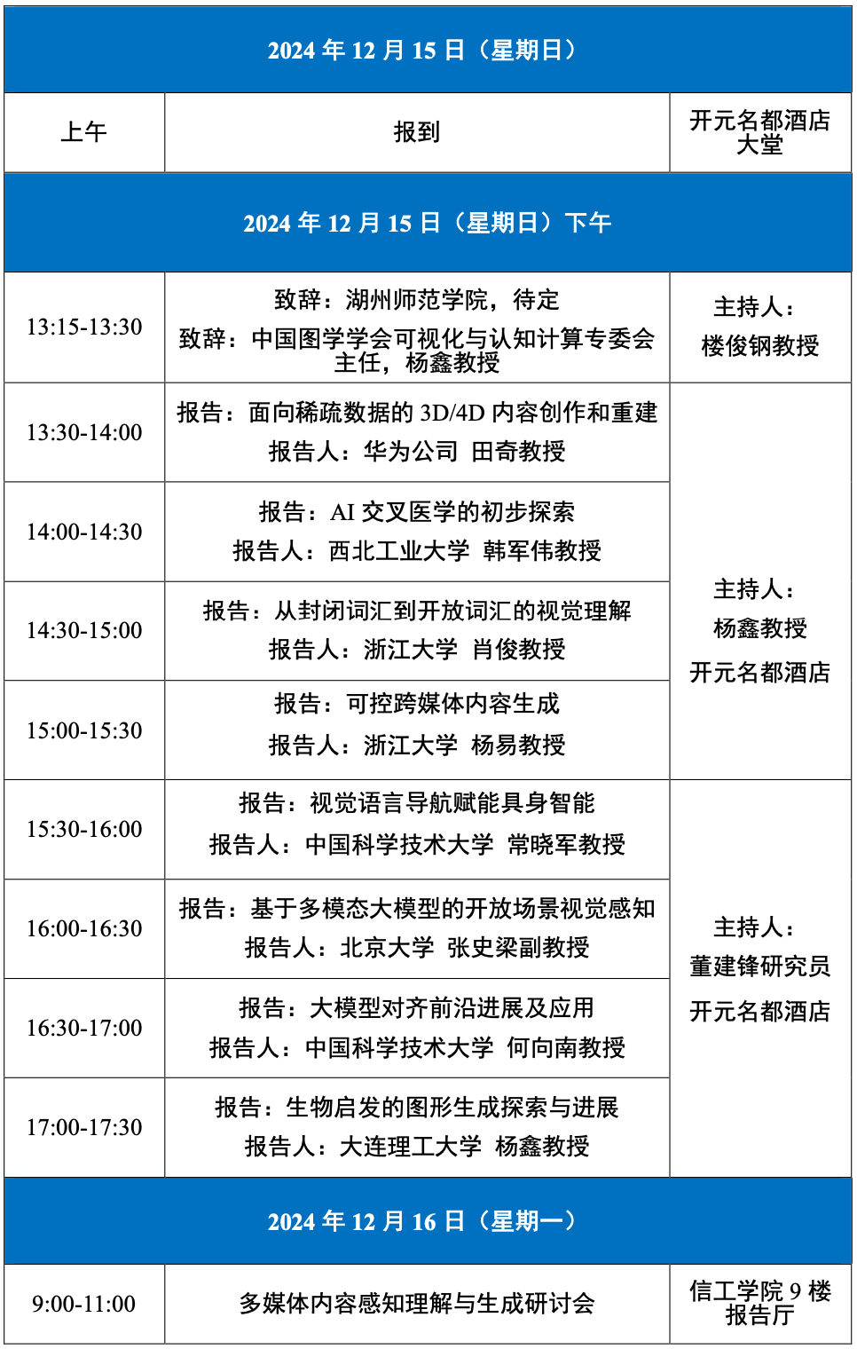 报告人简介:杨易,国家特聘专家、浙江大学求是讲席教授(二级教授)、计算机学院副院长、微软-教育部视觉感知重点实验室主任。担任科技部 2030“新一代人工智能”重大项目负责人、国家自然科学基金联合重点项目负责人、国家自然科学基金重大项目课题负责人。Google Scholar 引用数7万余次,H-index 131,近7年在计算机课工程学两个领域连续入选Clarivate Analytics全球高被引学者。获教育部全国优秀博士论文、澳大利亚基金委青年研究职业奖(ARC DECRA)、澳大 利亚计算机学会颠覆创新金奖、谷歌学者研究奖、澳大利亚科研终身成就奖、 亚马逊机器学习科研奖、CCF-A类会议IJCAI最具影响力论文(2021)、CCF-A类会议ACM MM唯一最佳论文奖(2023)等多项AI领域国际奖项,以及20余次国际科研竞赛世界冠军。担任多个知名国际期刊与会议的重要职务。