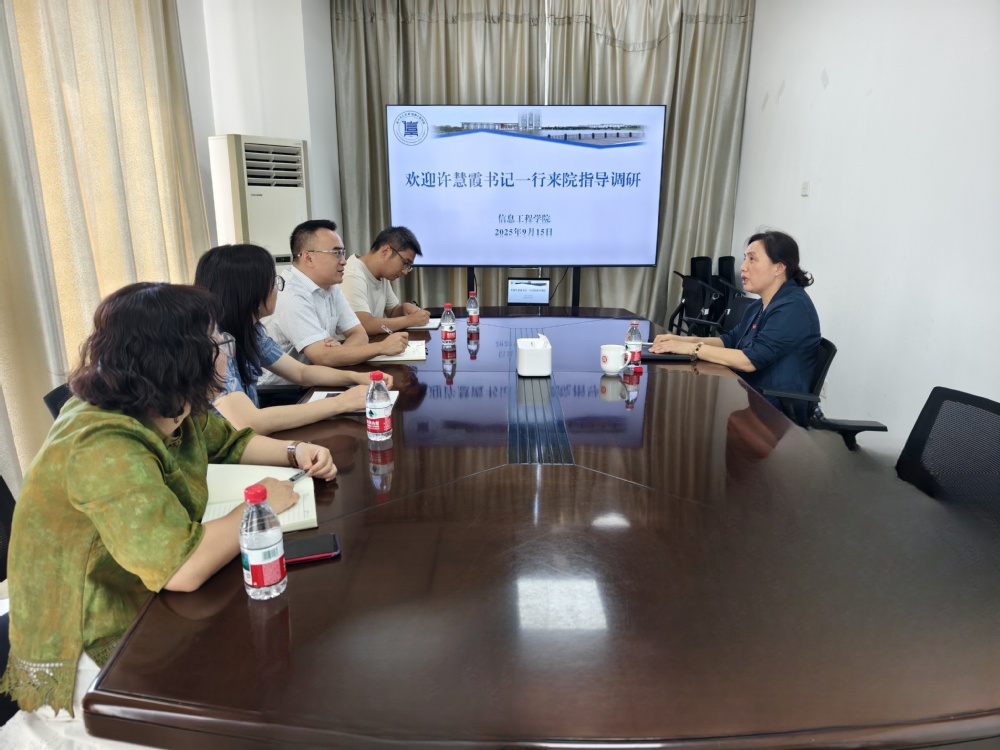 9月15日上午,学院联系校领导、校党委书记许慧霞在党校办工作人员的陪同下到信息工程学院调研新学期开学工作,并就下半年学院重点工作进行指导,学院领导班子成员参会交流。
