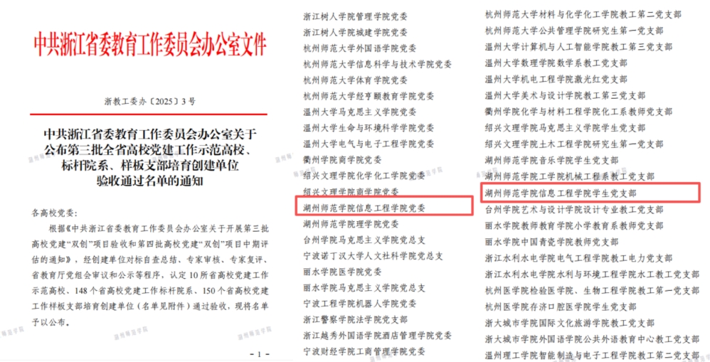 近年来,学院党委入选全省高校党建工作“双创”项目4项,获评省高校党建特色服务品牌、省青年文明号、湖州市先进基层党组织等重要荣誉。计算机科学与技术学科入选省一流学科(A类培育),被列为校博士点重点培育学科,上榜中国软科最好学科排行榜,成功进入ESI全球排名前1%,学院连续4年获评校“先进单位”。