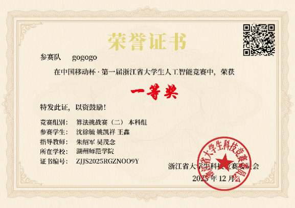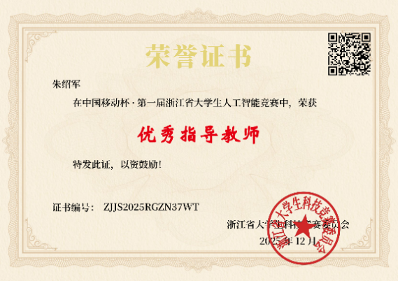 近日,2025年“中国移动杯·第一届浙江省大学生人工智能竞赛”决赛在杭州电子科技大学圆满结束。全院共选派11支队伍参赛,经过初赛筛选、复赛答辩等环节的激烈角逐,我院学子共斩获省级奖项5项,其中一等奖1项,二等奖2项,三等奖2项;信息工程学院朱绍军老师获优秀指导教师。大赛荣誉的背后,是学子们的艰苦努力和指导老师的辛勤付出,也彰显了我院在人工智能算法及应用方面的实践教学成果。