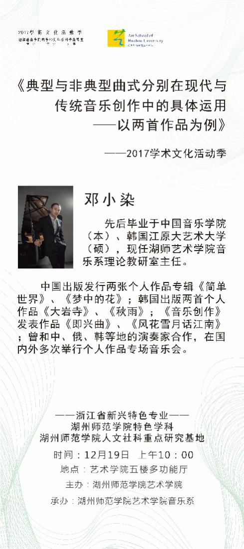 邓小染,先后毕业于中国音乐学院(本)、韩国江原大艺术大学(硕),现任湖师艺术学院音乐系理论教研室主任。