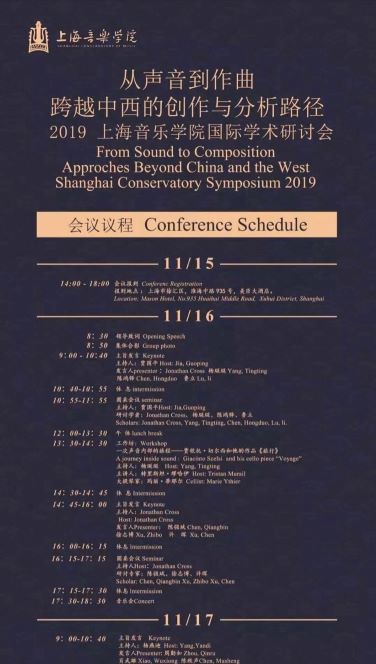 2019年11月16日,我院副教授鲁立博士受邀参加了由上海音乐学院“国际一流作曲优米app官方下载入口手机版与实践战略创新团队”与“国际作曲理论研究(重点)团队”携手主办的题为“从声音到作曲·跨越中西的创作与分析路径——2019 上海音乐学院国际学术研讨会”(From Sound to Composition Approches Beyond China and the West Shanghai Conservatory Symposium 2019)的系列学术活动。会议历时2天,为来自英国、法国、维也纳、中国等海内外精英作曲家、分析学家提供了一个互相交流的国际平台,