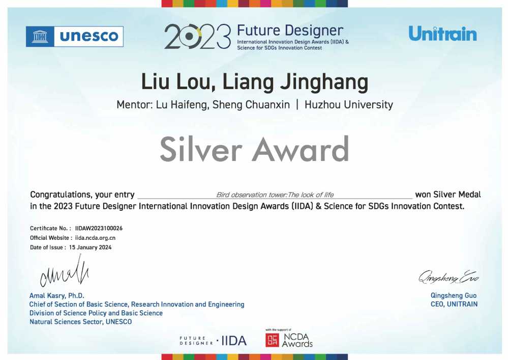 我院研究生刘楼、梁景杭共同完成的设计作品《Bird Observation Tower:The Look of life》获得IIDA大赛银奖。