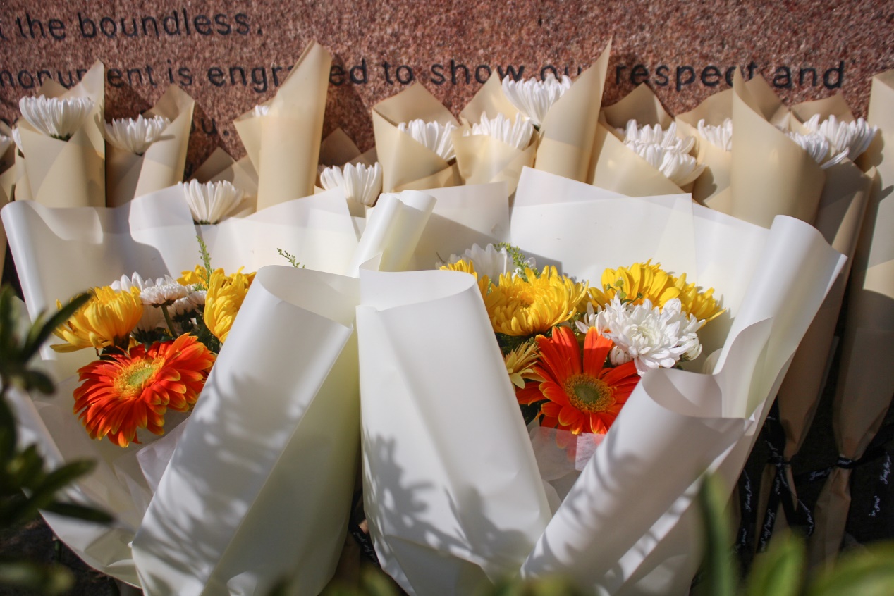 默哀毕,学生代表们献上鲜花并鞠躬致意。馨香萦绕碑间,承载着对“无语良师”的至高敬意和感谢。