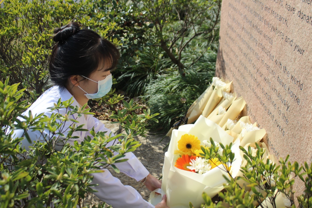 随后,全体学生手执素菊低首默哀一分钟,向“无语良师”深切缅怀并致以崇高敬意,感奉献之精神万古长青、无限延续,思生死之哲学庄严超然、洗礼众生。