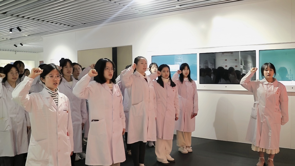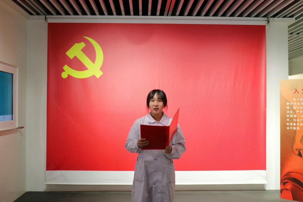 参观结束后,开展新党员宣誓仪式,学院教工党员为新发展预备党员佩戴党徽,颁发党章。党徽是入党的决心,亦是为党与人民服务的责任的标志。紧接着新发展党员代表魏琪同志发言并宣讲身边榜样潘美儿老师的事迹。魏琪同志表示“作为医学生,我们也要时刻保持对患者的尊重和同情,用爱心和耐心去进行每一次的医疗服务,为提高人类健康水平和医疗护理质量贡献自己的力量。”