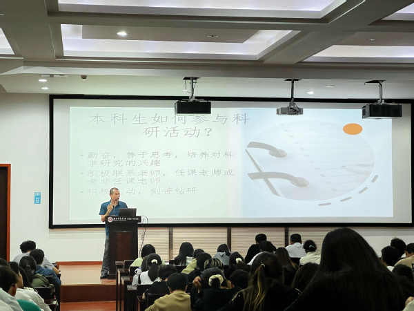 讲座伊始,周洪昌院长从科研竞赛的意义切入,引导和鼓励大家在学有余力时,积极参加学生科研竞赛。紧接着,刘鸿芳老师向大家介绍学院近两年学生科研竞赛和专利论文发表情况,并重点介绍了两位优秀的科研典型代表和获取科研竞赛信息的途径,旨在让同学们对科研竞赛有个初步了解并引导学生树立奋斗目标。最后,林奕斌老师从为什么要做科研和如何做科研这两个方面着手,给同学们进行学生科研启蒙与指导专题讲座,旨在帮助同学们深刻认识到科研竞赛对本科生成长成才的重要意义。