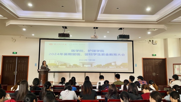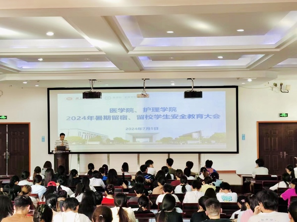 为落实暑假留宿、留校学生安全管理工作,进一步提升学生的安全意识,7月5日下午,医学院、护理学院在26-114报告厅召开2024年暑期留宿、留校学生安全教育大会。此次会议参会人员包括学院党委副书记许莹莹老师、院系公寓辅导员刘鸿芳老师以及2024年暑期留宿、留校学生等400余人。