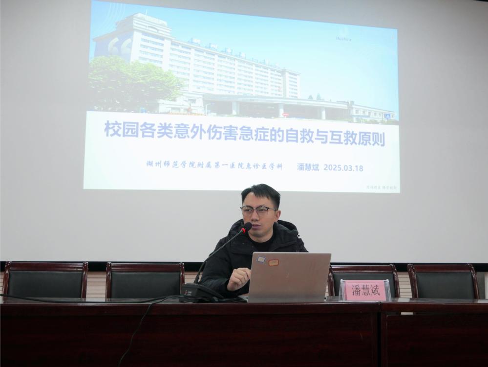 活动现场,湖州市第一人民医院急诊医学科潘慧斌医生,讲解了意外伤害、急症的急救互救原则、正确拨打急救热线电话以及各类急症的早期自救互救注意事项,提醒同学们在日常学习生活中要有意识地规避各类安全隐患。湖州市第一人民医院关节和运动医学外科张占丰医生给同学们分享了在校园中常见的肌肉拉伤、韧带拉伤、关节损伤、肌肉痉挛等运动损伤类型和相关预防知识,告诉同学们在运动前做好热身准备,避免运动造成的身体损伤。