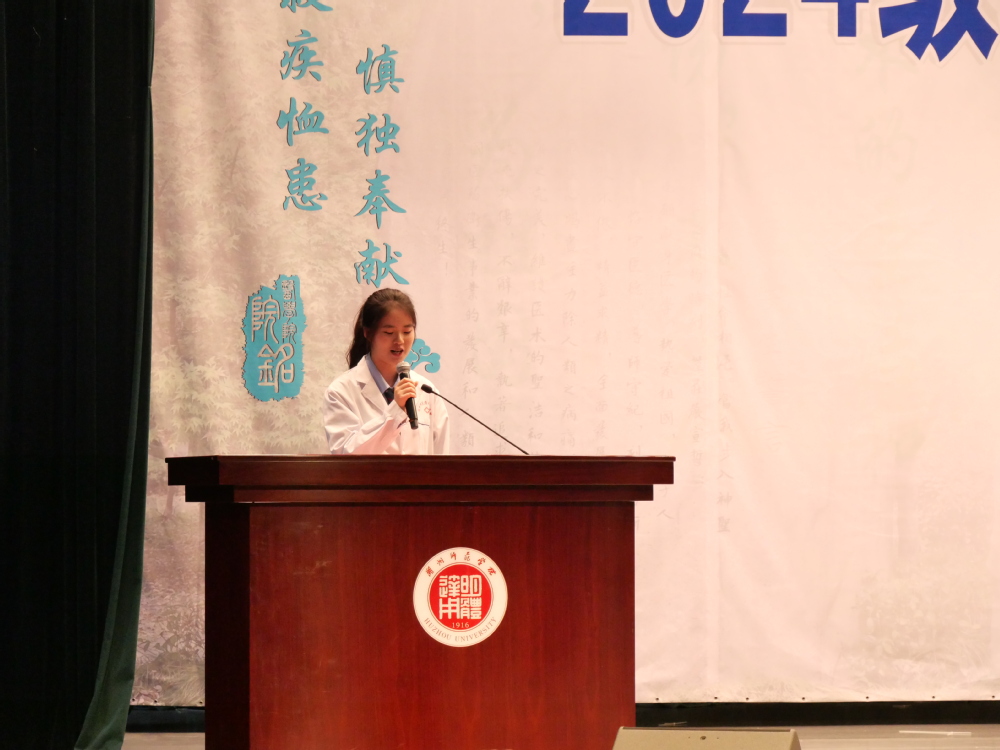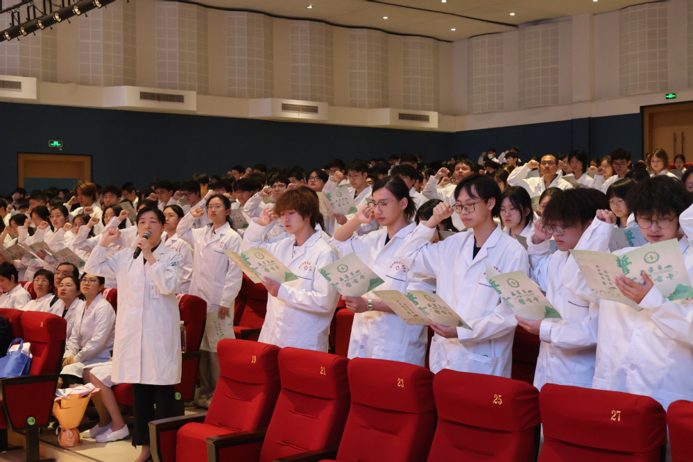 “健康所系,性命相托。当我步入神圣医学学府的时刻,谨庄严宣誓:我志愿献身医学,热爱祖国,忠于人民……”445名2024级新生身穿白衣,在附属第一医院副院长张颖的带领下庄严宣誓。