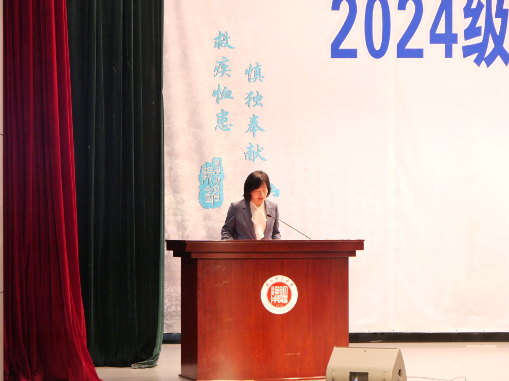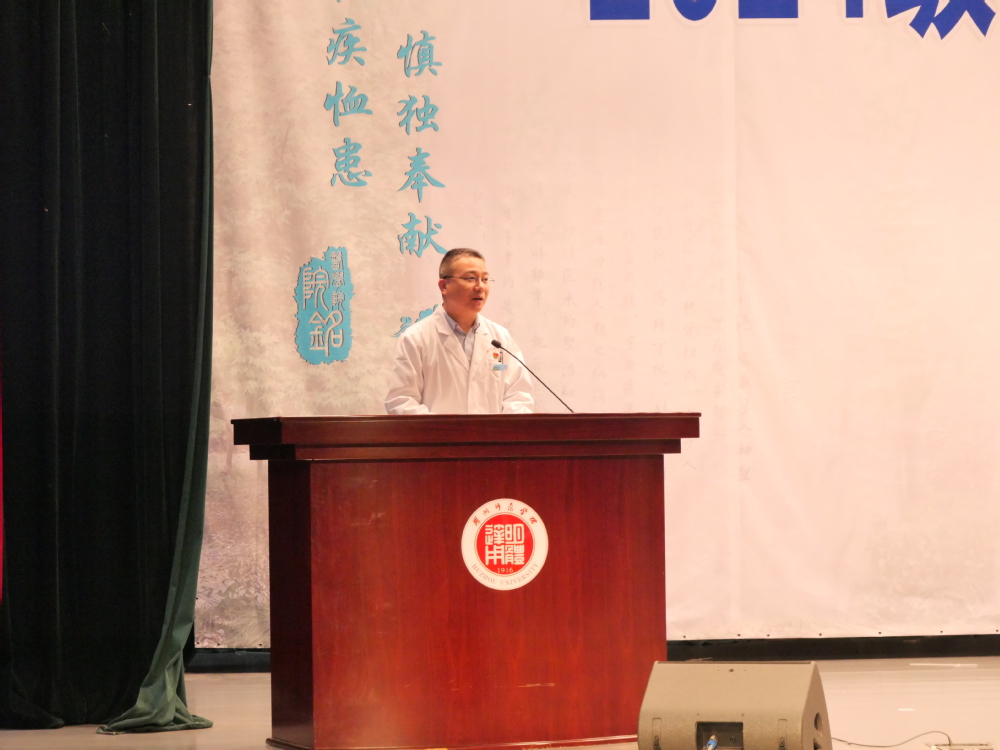 附属中心医院副院长胡鸿宇对医学生誓言内涵和职业精神进行了解读,他指出,医学生誓言虽然只有短短的129字,但承载着医学千年文明的重量,凝聚着无数前辈的赤诚之心,更昭示着每一位医者终身的信仰与追求。他强调,医学教育不应止于技能传授,更要培养“以天下为己任”的胸怀。今天的宣誓只是起点,真正的誓言不在言语,需要同学们以实际行动来践行。