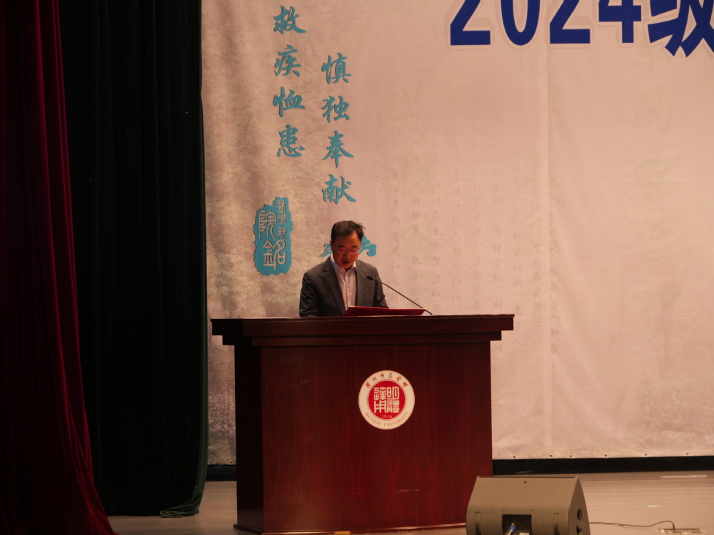 仪式最后,丁敢真代表学校向2024级全体医学生表示亲切的问候,向关心支持我校医学教育事业发展的市卫健委、相关医疗机构,以及医学院的广大校友们表示衷心的感谢,向为我校医学教育工作付出辛勤劳动的老师们表示诚挚的敬意。他对2024级医学生提出了三点希望:赓续医学血脉,有主动担当的作为;厚积医学知识,有不断创新的勇气;不畏艰难困苦,有坚韧不拔的品质。