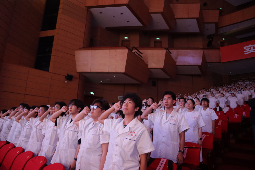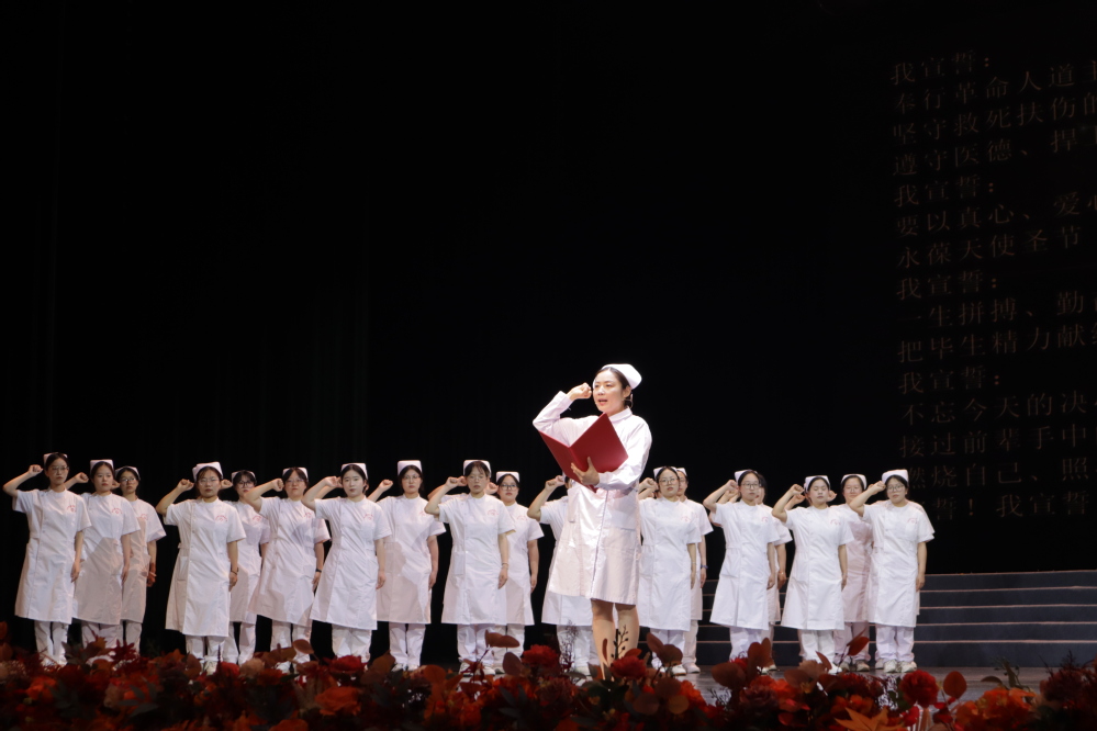 第42届南丁格尔奖获得者、浙江省皮肤病医院副院长、我校优秀校友潘美儿带领医学院(护理学院)全体准护士进行了庄严宣誓。227名即将走上临床实习岗位的护理学生身着洁白护士服,右手高举握拳,铿锵誓言响彻会场,字字句句饱含着对护理事业的忠诚与热爱。他们承诺将接过守护生命的接力棒,以坚定的信念和无私的奉献,踏上神圣的护理征程。