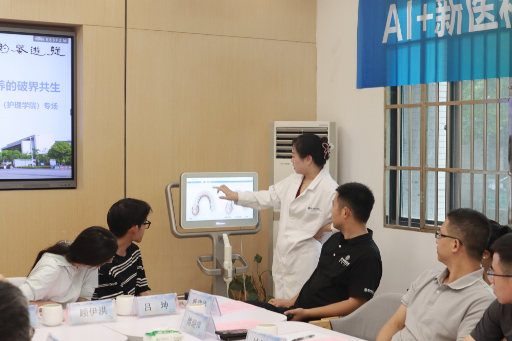 交流环节,在场嘉宾与师生代表踊跃发言,围绕人工智能对新医科优米app官方下载入口手机版的影响路径展开深入探讨。吴茂念首先对“AI + 医疗”的基本现状、发展历程及未来趋势进行了简要解读;附属第一医院王宵一副院长和潘慧斌医生分享了医院在“AI + 医疗”领域的探索与应用实践;杭州口腔医院湖州分院徐小琴主任通过现场演示“AI + 医疗”设备,直观展现了当前AI在口腔医疗领域的现实应用场景。