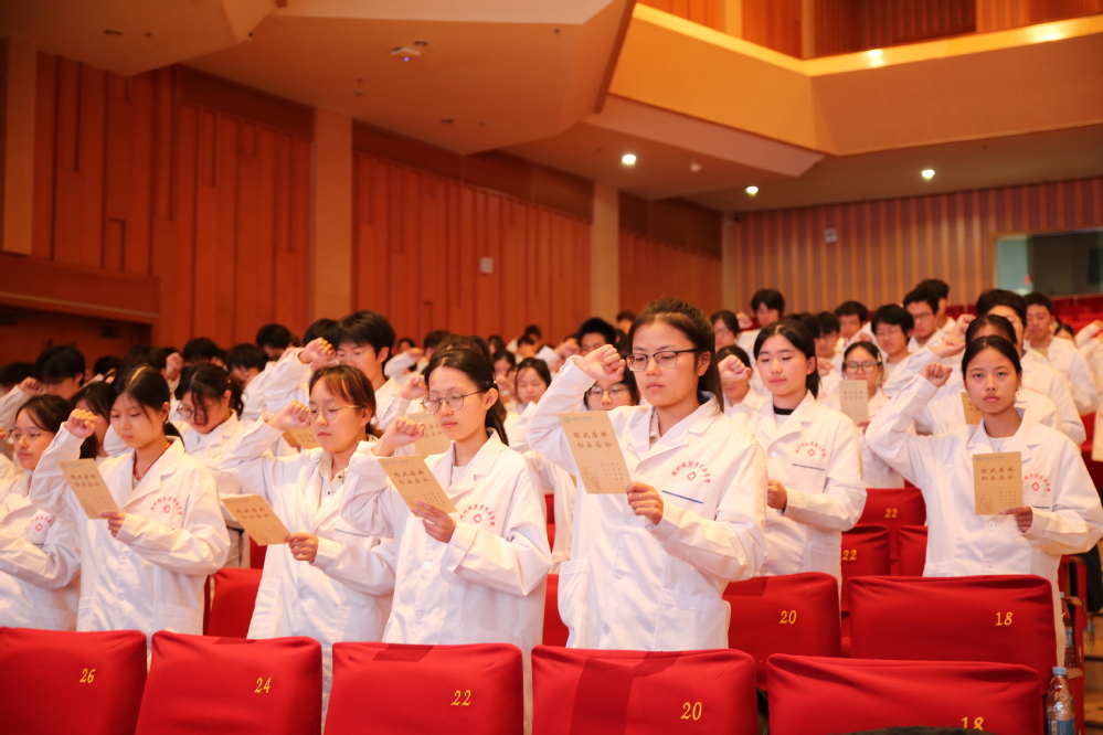 在附属中心医院副院长胡鸿宇的领誓下,2025级全体医学生庄严宣誓,铿锵有力的誓言响彻会场,这既是对医学事业的郑重承诺,更是对青春使命的庄严宣告,彰显了新一代医学生的责任与担当。