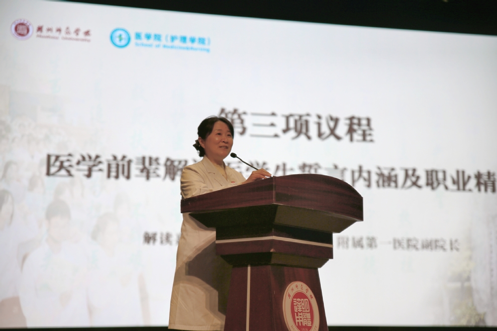 附属第一医院副院长王霄一对医学生誓言内涵及职业精神进行解读,帮助新生深刻理解医学职业的责任与担当。她指出,医学不仅是一门技术,更是一份沉甸甸的责任,鼓励同学们成长为有温度、有担当、有技术、有创新能力的好医生。