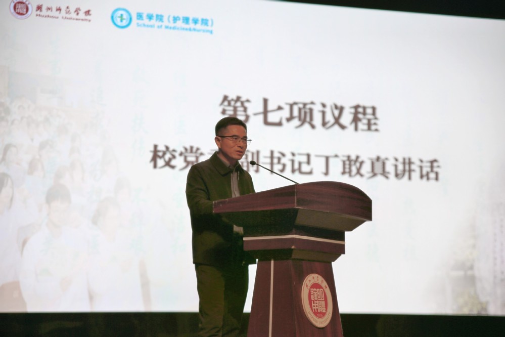 校党委副书记丁敢真代表学校向关心支持医学教育的各界领导、医护同仁及校友致谢,向新生致以问候。他指出,白衣加身意味着身份的转变,前辈为新生扣上“第一粒扣子”,是初心与担当的传承。他希望新生忠于选择,将个人理想融入健康中国建设;追求卓越,锤炼过硬医术;勇于突破,拥抱时代变革,做医学疆域的“拓荒者”。