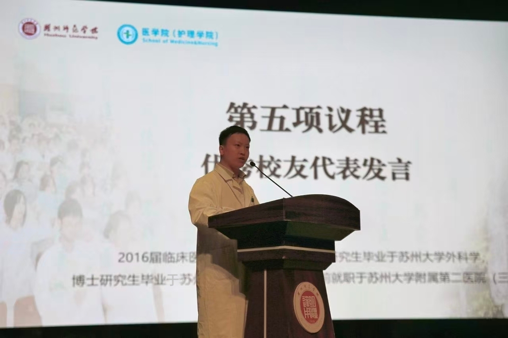 我校2016届临床医学专业校友代表、苏州大学博士、苏州大学附属第二医院医生丁启峰分享了自己的成长历程。他回顾了在母校的求学岁月,感谢母校的悉心培养与恩师的谆谆教诲,以“仁爱之心、求知之诚”为核心,勉励学弟学妹永葆初心做有温度的医者,持续学习做终身的学者,在医学道路上稳步前行。新生代表、2025级口腔医学专业方叶熙同学表示,相聚湖师是一种缘分,来到医学院,就是“医家人”。他代表全体新生表达了对医学事业的热爱与追求,表示将牢记前辈嘱托与铮铮誓言,以饱满的热情投入学习,以严谨的态度对待专业,以仁爱的之心对待患者,努力成为一名合格的医学生,不负韶华、不负重托。