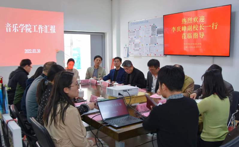 3月30日下午,副校长李庆峰一行前来音乐学院调研,梁卿院长、鲁立副院长分别向领导们进行了关于音乐学院发展建设的专题汇报,校人文社科处处长潘明福、社会合作处处长刘世峰、实验室管理处处长邵圣文、科技处副处长何小勤、党校办秘书费晓熠陪同调研。