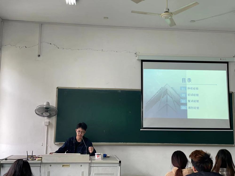 活动中,何欢畅从考研的目标、学习、心态三方面出发,使同学们对考研的准备工作有了进一步的认识和了解,强调了信息获取与资料搜集的重要性,并向同学们分享了自己考研时所用的一些资料公众号和使用的建议,为同学们考研提供了莫大的信息支持。陈涛为同学们提供了报考院校和专业选择建议、学习建议和心态调整的方法,使同学们对考研目标的确定有了全面的把握,并详细的分享了各科的学习资料推荐和学习方法,为同学们考研学习提供了引导帮助,并鼓励同学们“越努力,越幸运”。