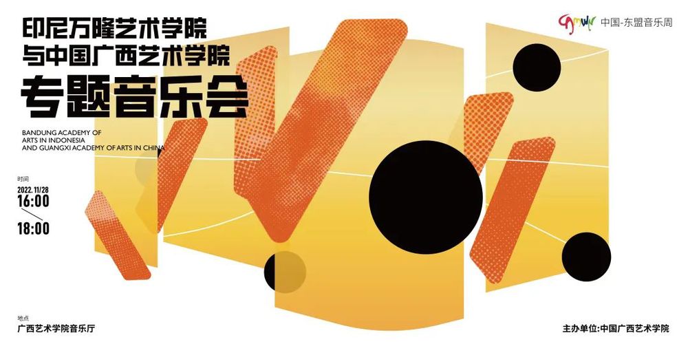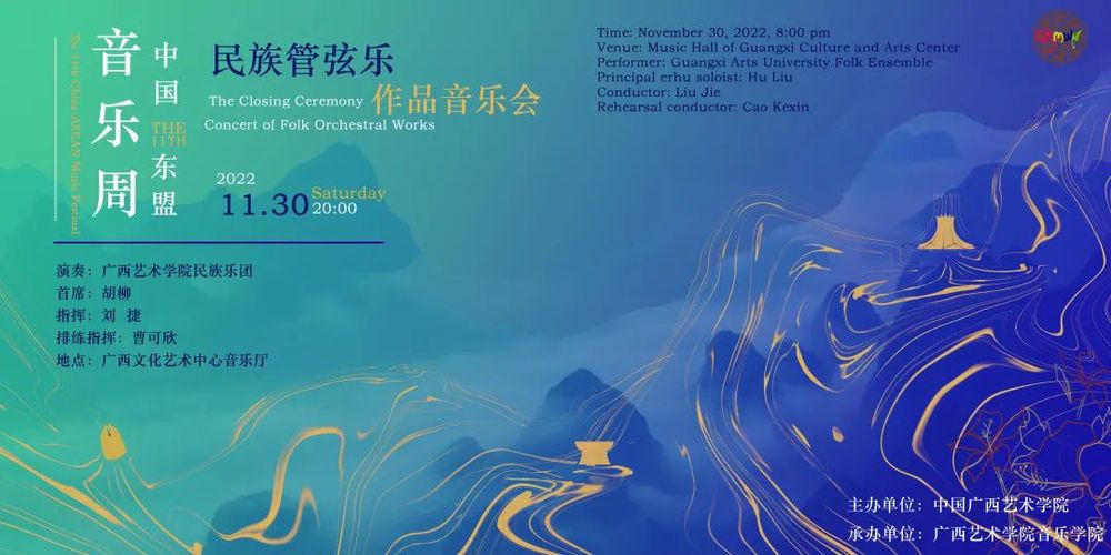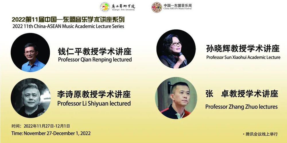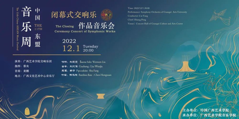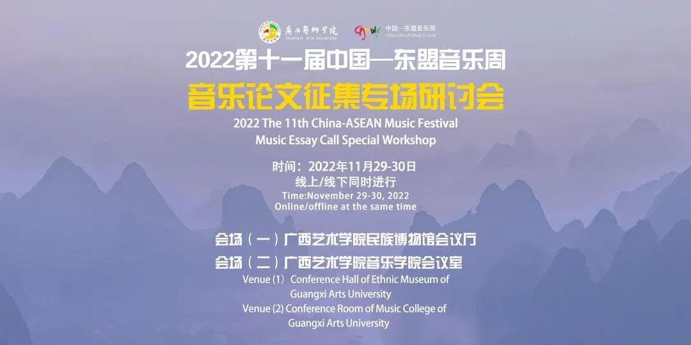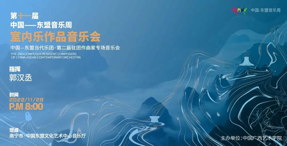 中国—东盟音乐周(China-ASEAN Music Festival)是广西艺术学院主办的国际大型音乐文化交流活动。中国—东盟音乐周创办于 2012年,其宗旨是“中国·民族·东盟·超越”,该音乐周以中国、东盟各国及亚洲国家和地区为中心,并与欧美国家延伸联系和深入交流音乐新作品的创作、理论研究和音乐表演,还会推出新人新作,为音乐家建立良好发展平台和创造机遇,使中国音乐在全世界进一步扩大影响力。第十一届中国—东盟音乐周将于2022 年11月27日至12 月 1 日在中国广西南宁隆重举行。在为期五天的时间内,我们将为来访的音乐家提供一个高端的交流平台,为听众奉献一场场富有民族特色、地域特色的音乐盛宴。