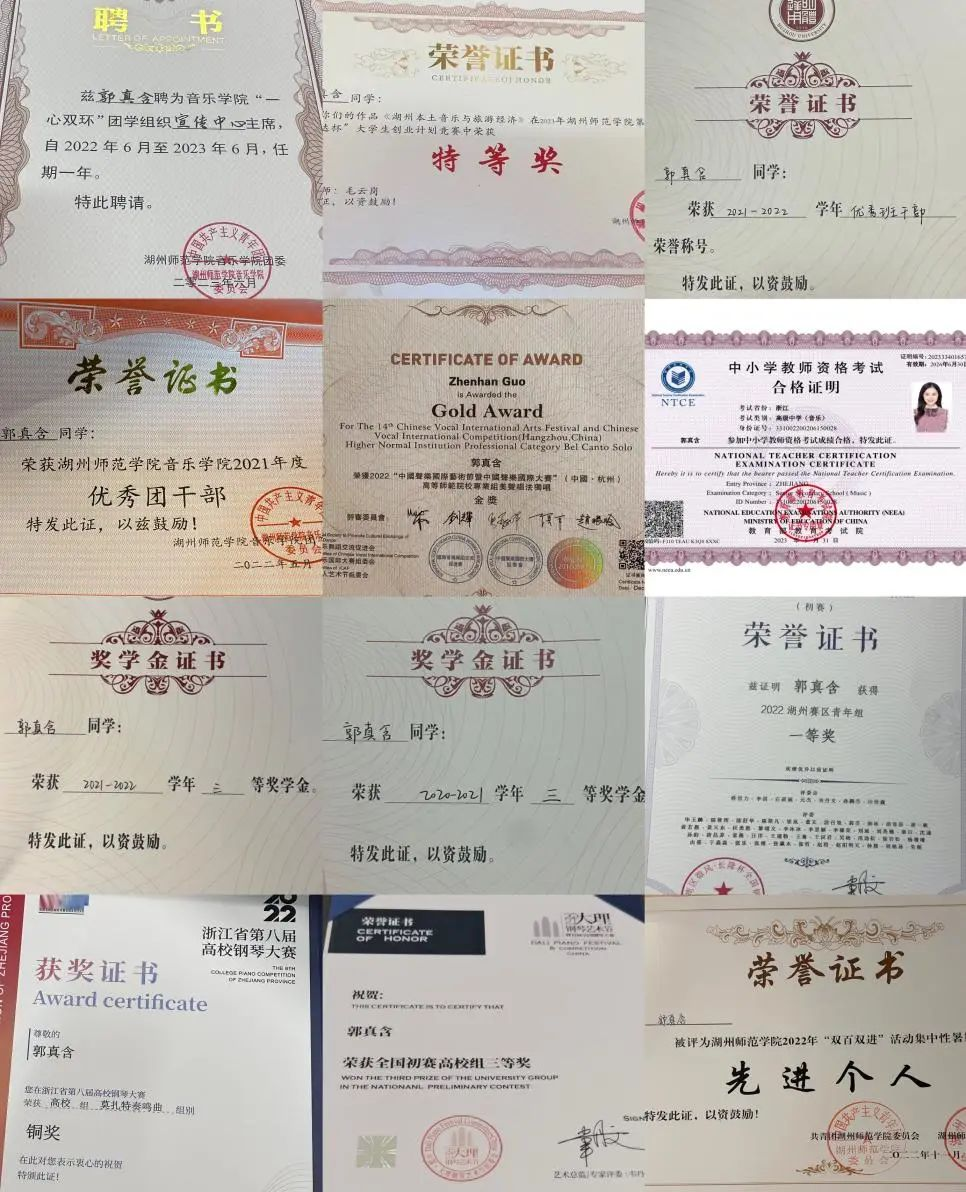 10.2022年获得浙江省第八届高校钢琴选拔赛自弹自唱组一等奖;