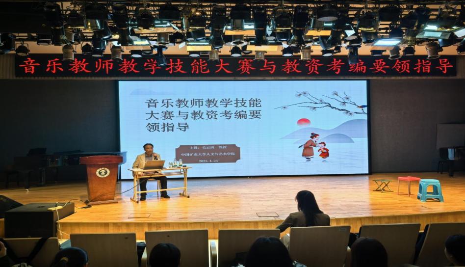 4月23日,在中国矿业大学人文与艺术要领学院的讲座中,毛教授针对数十位将要步入社会的音乐教育专业研究生,以“音乐教师教学技能大赛与教资考编要领指导”主题,通过“弹唱考试攻略”、“中小学课堂乐器教学”、“器乐编配技巧”和“教学案例分析”等音乐教师必备理论知识和实践技能进行详细讲解,并传授了中小学音乐教师入编考试注意事项,使广大同学受益匪浅。此外,毛教授还为本院将要参加“全国首届艺术硕士研究生音乐教育领域专业实践能力比赛”几位同学进行了一对一指导,针对同学们在教学设计、试讲环节和展业技能展示方面的薄弱之处进行深入剖析。现场师生积极互动,气氛热烈。讲座最后,毛教授还现场演奏了竹笛和葫芦丝精品曲目《小放牛》、《月光下的凤尾竹》,完美体现出“讲演结合”的艺术氛围。