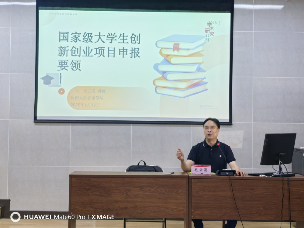 6月12日,毛云岗教授受邀回到母校河南大学音乐学院作“国家级大学生创新创业项目申报经验分享”专题讲座。本场讲座核心聚焦于国家级大创项目申报的实战指导:在项目类型解析上,毛教授阐述了大学生创新创业计划项目、全国大学生“挑战杯”大赛和“互联网+”大学生创新创业大赛三大类项目的内容与申报项目的重要环节;通过结合多年的指导经验与典型案例,深入解析了如何从多个维度挖掘具有创新性的科研选题;申报关键要点方面,紧密围绕实际需求,在选题价值、研究方法到商业计划书撰写、市场分析、团队协作等环节,提供了兼具理论高度与实践价值的指导,为现场学生申报项目搭建了清晰的思维框架和行动指南。并在讲座期间以竹笛和葫芦丝演奏展示了音乐魅力,深化了师生对文化多样性的理解,活跃了现场气氛。讲座反响热烈,成效良好。