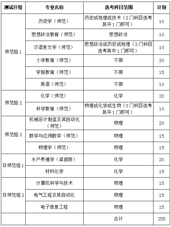 第十一条 2022年招生计划总数235人,测试分组、专业名称、选考科目范围、招生计划如下:
