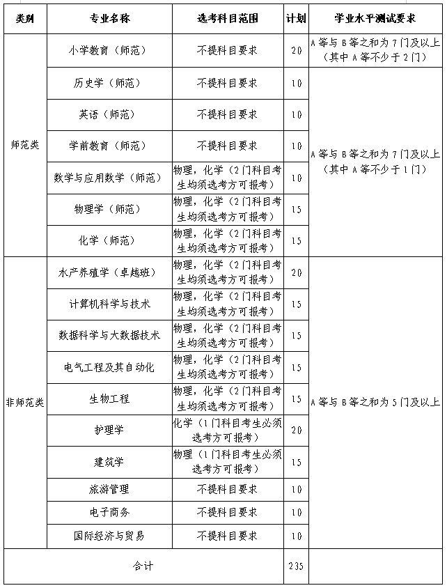 二、师范类:小学教育(师范)要求高中学业水平测试科目A等与B等之和为7门及以上(其中A等不少于2门),且其余为D等(新高考改革前的往届生为C等)及以上;其余师范专业要求高中学业水平测试科目A等与B等之和为7门及以上(其中A等不少于1门),且其余为D等(新高考改革前的往届生为C等)及以上。